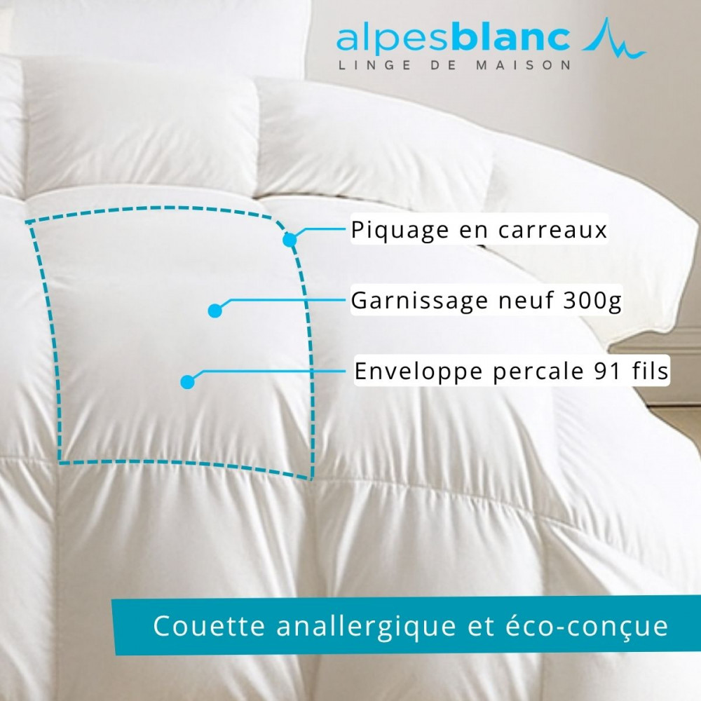 - FABRICATION FRANÇAISE : couette haut de gamme éco-conçue avec un garnissage neuf de 90 % duvet et 10 % plumettes de canards français. Traité Microstop, anallergique, isolante et respirante.