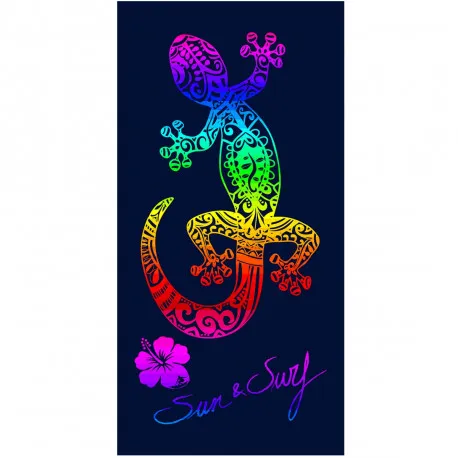 Apportez une touche exotique et colorée à vos journées à la plage avec cette superbe serviette Sun & Surf au motif lézard multicolore sur un fond bleu profond.