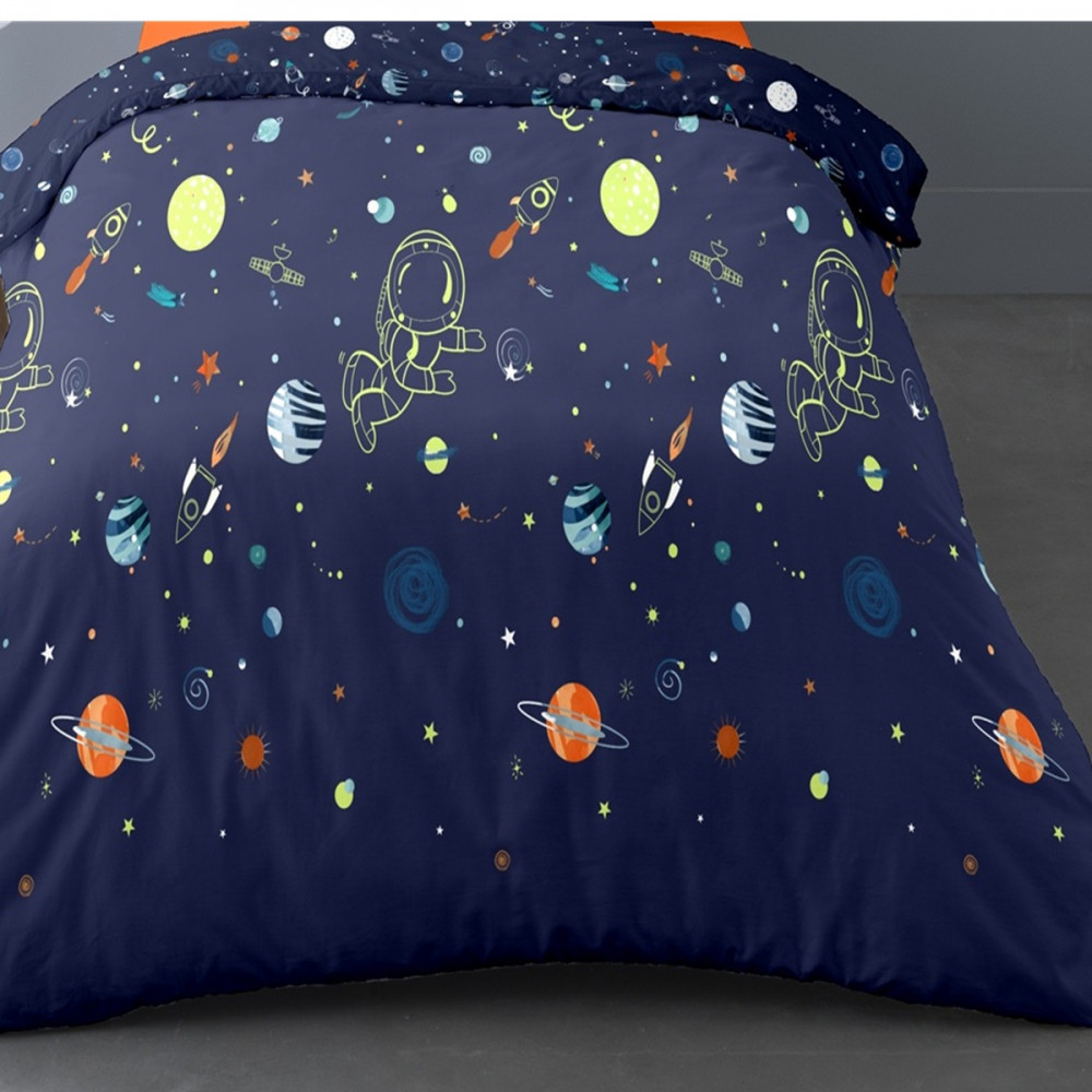 Housse de couette une place, univers espace, sur le lit visuel d'amabiance, hdc bleu nuit et détails colorés