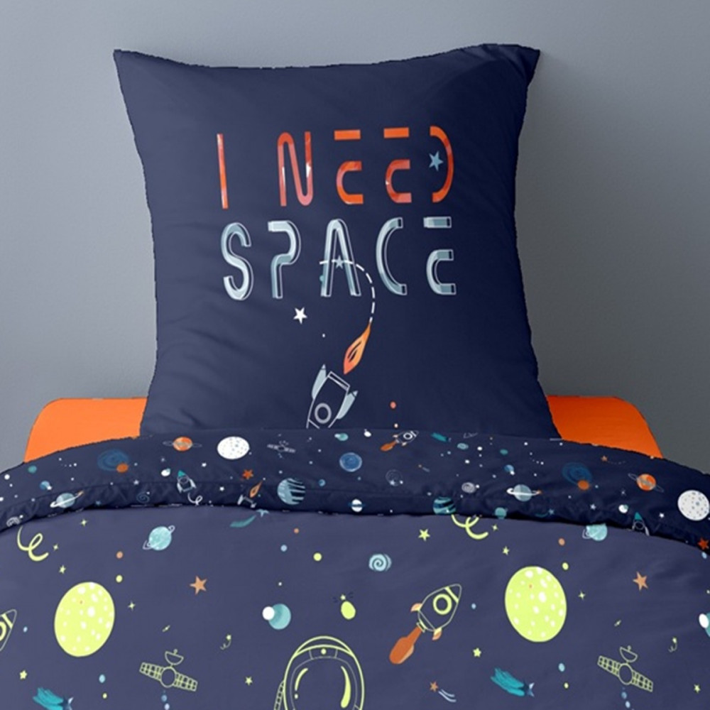 Plongez dans l’univers de l’espace avec cette housse de couette 1 personne au design ludique et moderne, idéale pour les enfants et les amateurs d’astronomie. Sur un fond bleu nuit profond, des motifs colorés d’astronautes, de planètes, de fusées et d’étoiles créent une ambiance cosmique apaisante et pleine d’imagination. La taie assortie arbore l’inscription « I NEED SPACE », apportant une touche originale et tendance à la parure.