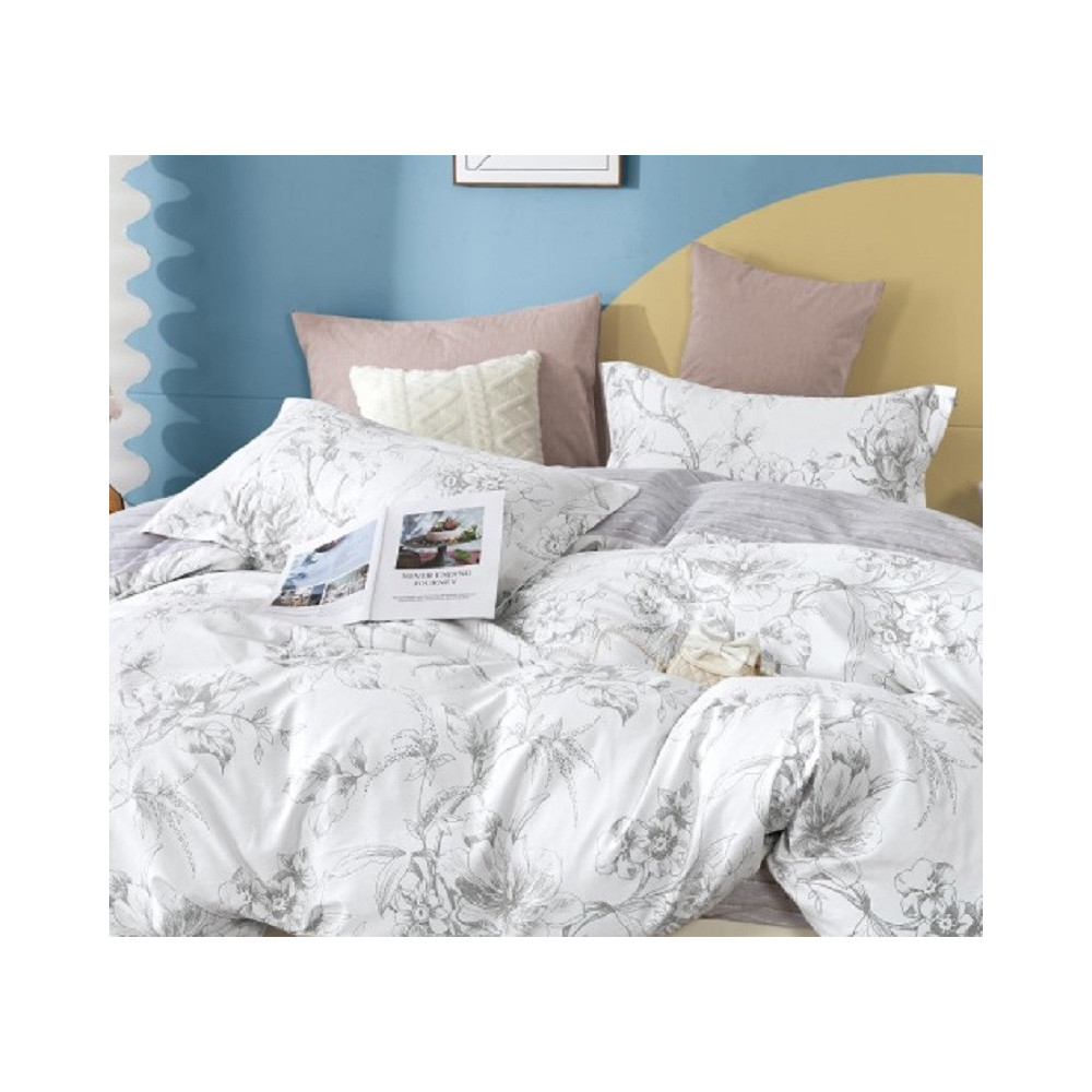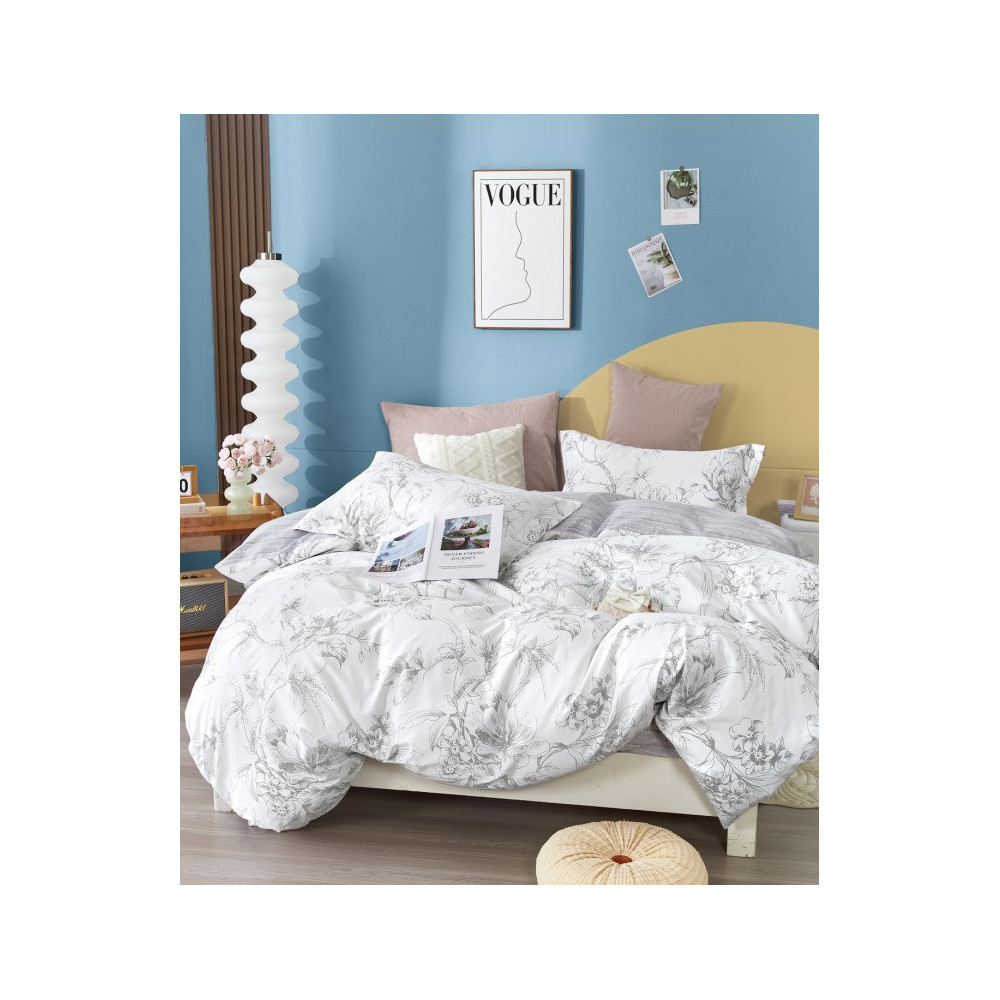 Housse de couette avec motifs fleurs, réversible Gris et Blanc 100% percale de coton