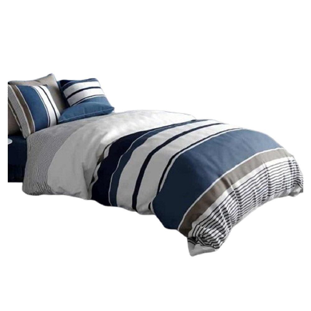 Les motifs linéaires de couleurs bleues, taupe et blanche avec sa finition bouteille permettront à votre de couette de rester bien en place. Les taies d'oreillers sont également fournies et assorties à la housse de couette.