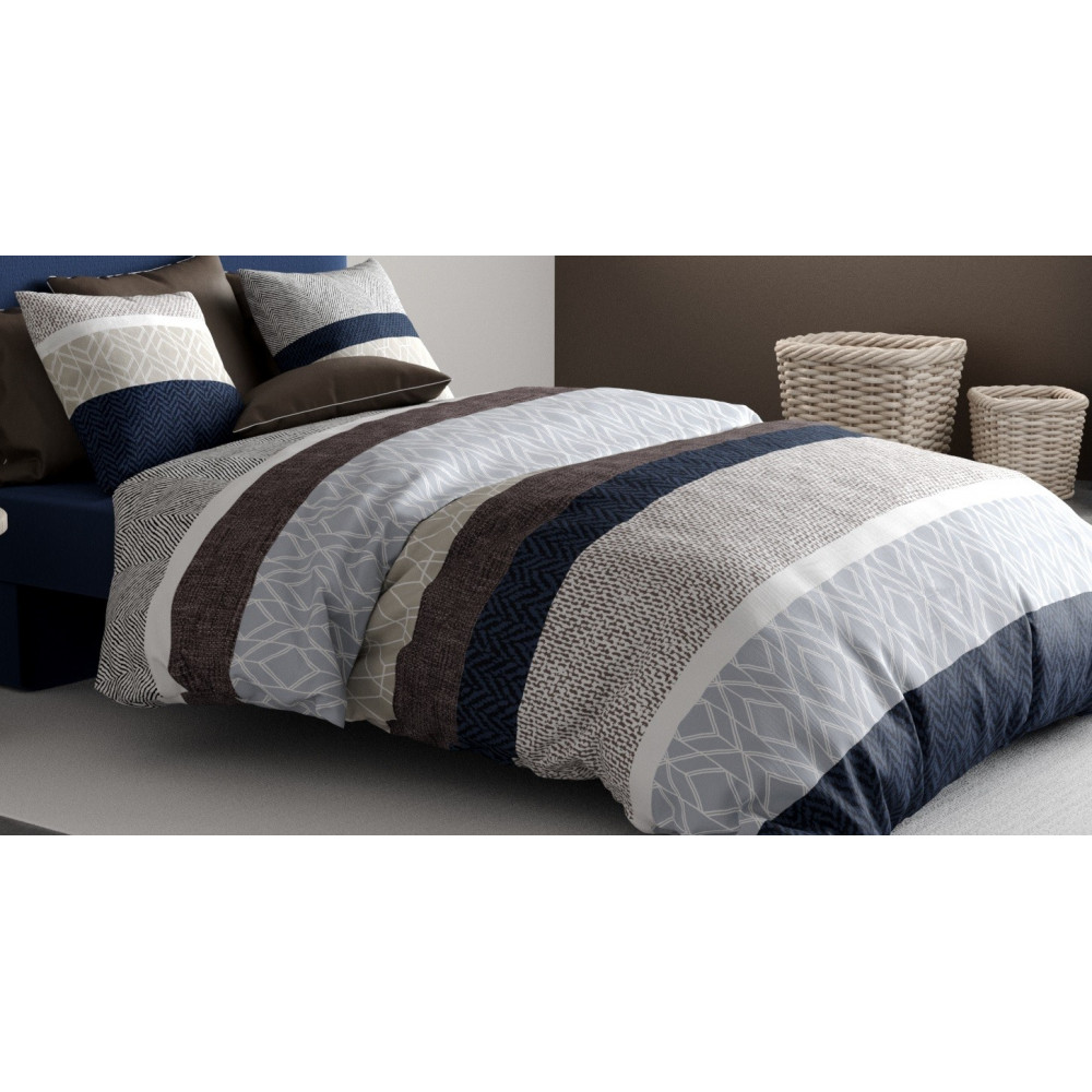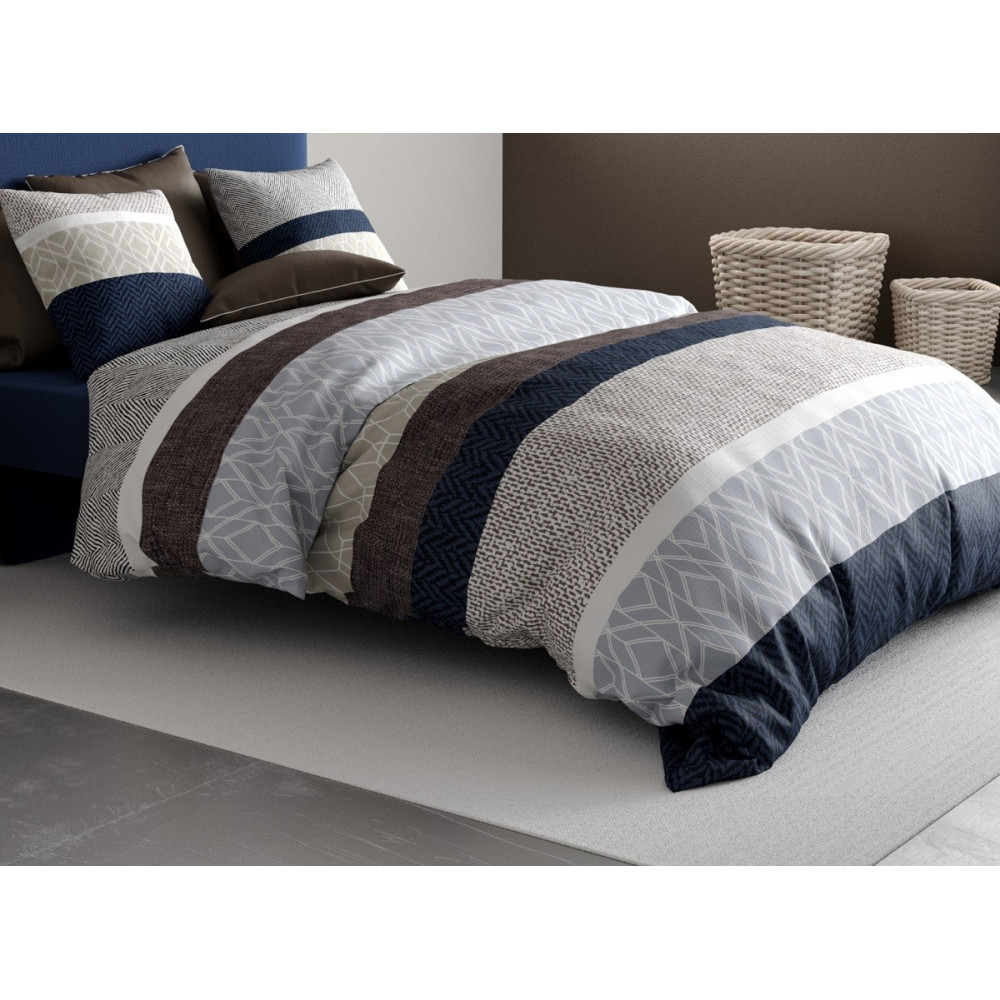 Housse de couette 260x240 cm pour un lit deux places aux couleurs Bleu, Noir, Blanche, et Grises. Un tissage de 57 fils/cm² de qualité durable et française.