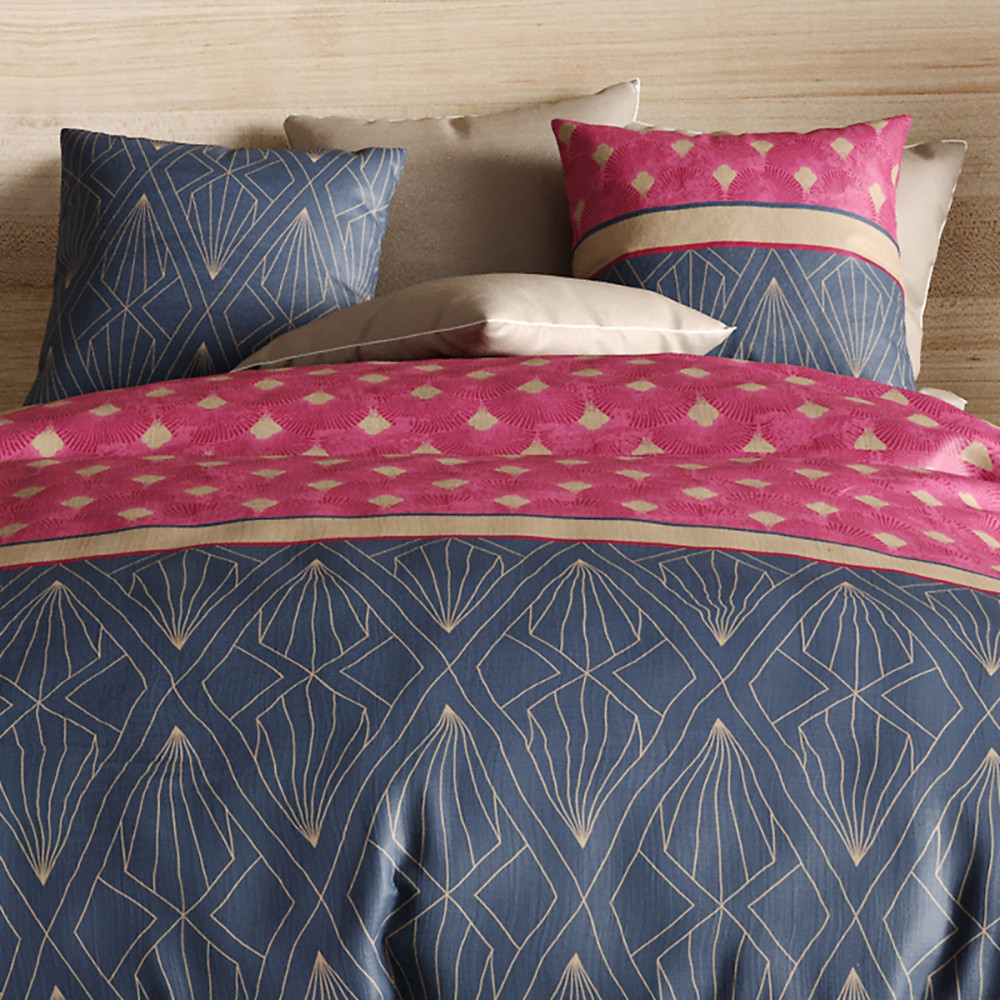 La partie supérieure de la housse de couette Lily 240x260 cm exploite des motifs de losanges de couleur sable sur un fond fuchsia, tandis que la partie basse, plus volumineuse, déploie un graphisme plus subtile sur un fond violet soutenu. Une bande de couleur sable sert de délimitation chromatique entre ces deux zones.