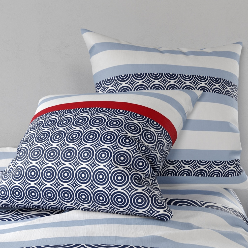 Le design de la parure de lit 240x260 cm Santorini est une fenêtre ouverte sur le grand large. Ses motifs et ses teintes de blanc et decbleu marine rappellent les paysages côtiers. Cet esprit marin affirmé transforme votre chambre en un espace serein qui invite à la relaxation. Les pointes de rouge bordeaux donnent une chaleur subtile qui évoque la douceur des soirées d'été.