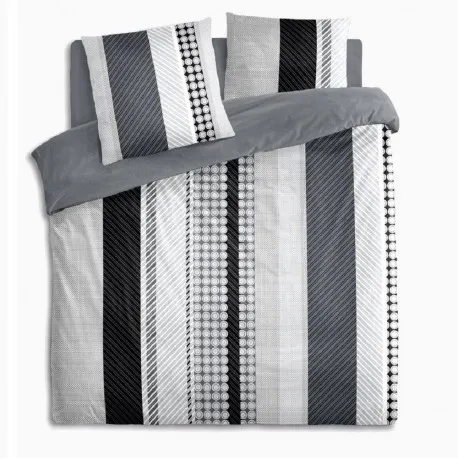 Apportez une touche moderne à votre chambre avec cette housse de couette aux designs géométriques. Avec des nuances de gris, de noir et de blanc, elle se distingue par ses larges bandes verticales aux motifs divers – rayures obliques, cercles.. – créant un ensemble harmonieux et contemporain.