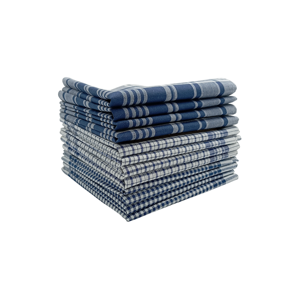 Lot de 12 mouchoirs avec trois types de quadrillages différents, des carreaux plus petits, moyen et plus grand, bleu et blanc.
