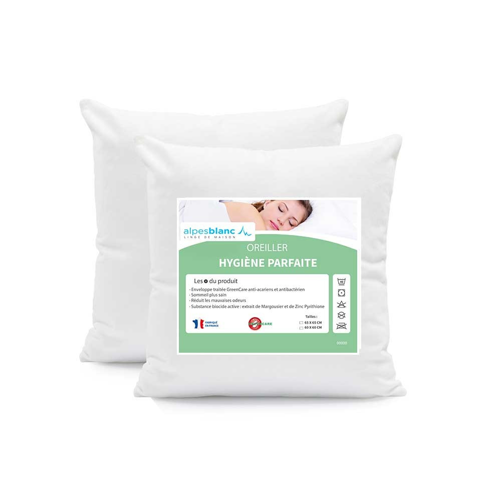 Lot de 2 oreillers anti-acariens 60x60 cm - Fabrication française, Hygiène active Aegis triple protection, garnissage polyester