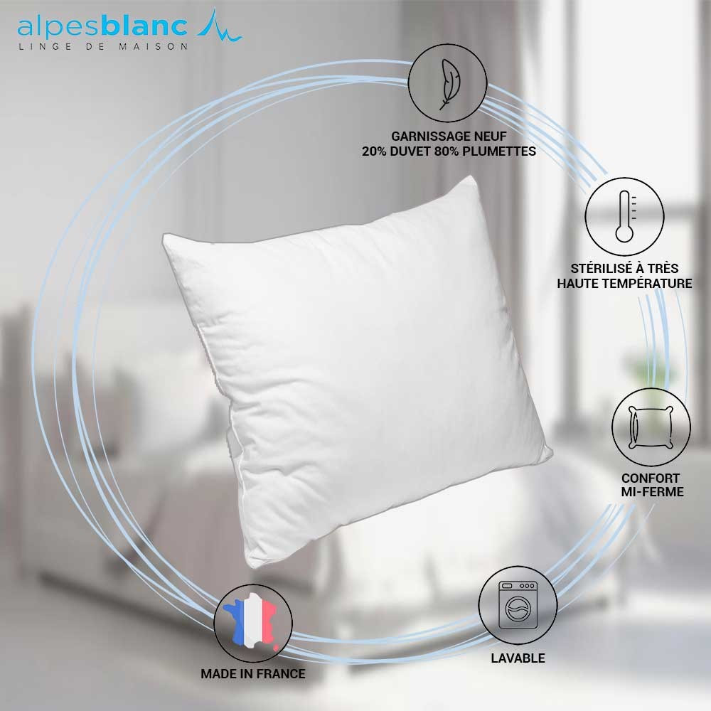 Oreiller naturel 20 % duvet / 80 % plumettes - Fabrication française, soutien mi-ferme, accueil moelleux, gonflant et léger - 65x65 cm