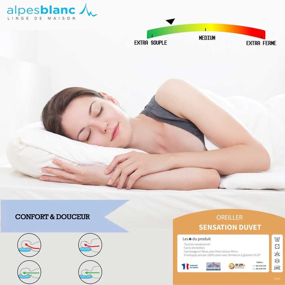 - PACK COMPLET 4 PIÈCES : 2 oreillers moelleux Sensation Duvet + 2 sous-taies 100% coton. Existe en format carrée 65x65 cm ou rectangulaire 50x70 cm. Idéal pour une literie bien protégée.
