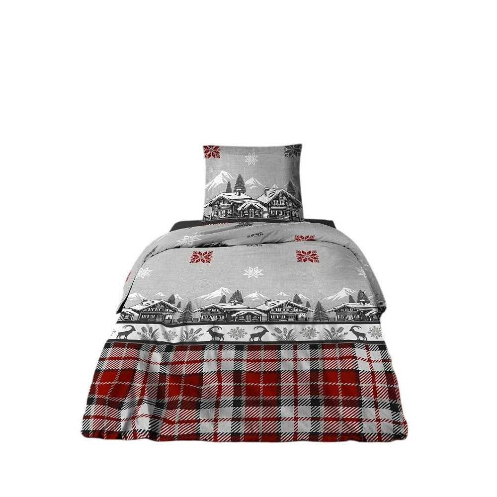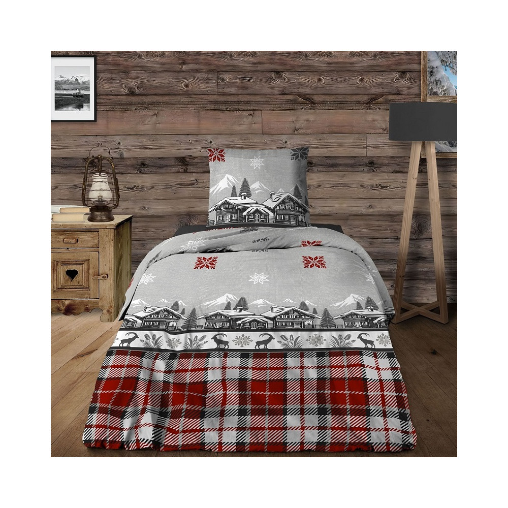 Parure de draps Chalet 100 % coton - Drap plat, drap housse et taie(s), Motifs montagne rouge et gris, Douceur et confort - 90x190 cm