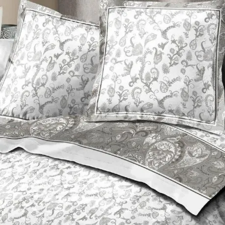 Visuel sur fond blanc, parure de drap en flanelle fleuri gris pétale 4 pièces, motif florales