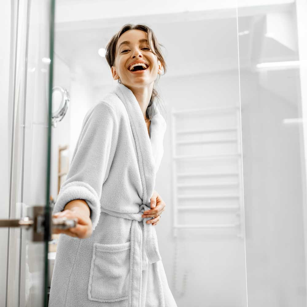 Grâce au mariage du coton peigné à fibres longues et des fibres de bambou, les peignoirs de la marque Alpes Blanc vous garantissent douceur et confort à la sortie de la douche.