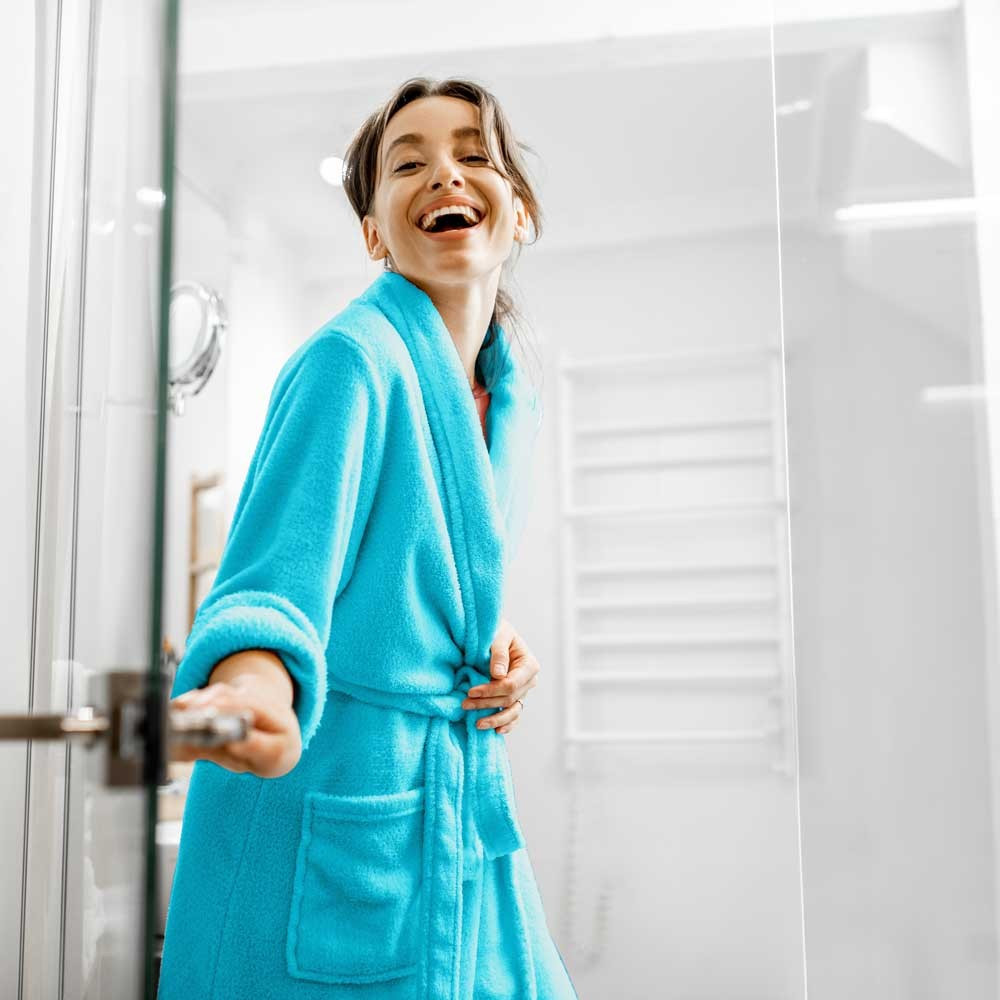 Grâce au mariage du coton peigné à fibres longues et des fibres de bambou, les peignoirs de la marque Alpes Blanc vous garantissent douceur et confort à la sortie de la douche.
