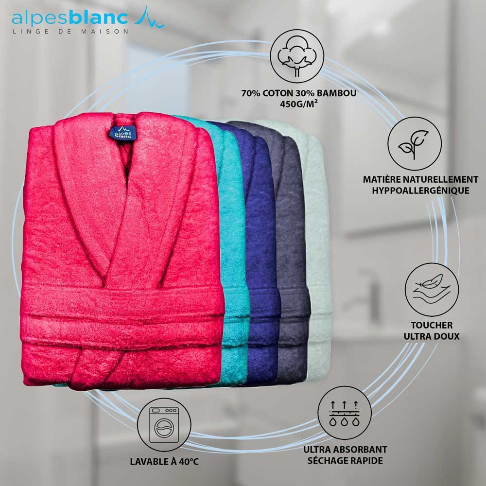 Alpes Blanc présente sa collection de peignoirs en coton et bambou ! Le mariage du coton et du bambou vous garantisse une douceur incomparable et une forte absorption, parfait pour un moment de relaxation en sortant de la douche !