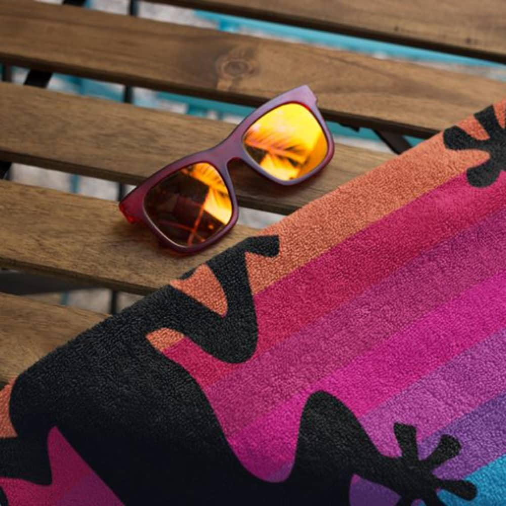 Ce drap de plage immense aux margouillats noirs sur fond multicolore ravira tous les amateurs grandes serviettes.