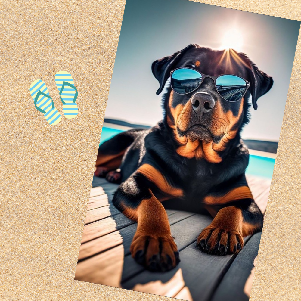 Affichez votre amour des chiens avec une touche de style grâce à notre serviette de plage Rottweiler Cool ! Son motif amusant d’un Rottweiler avec des lunettes de soleil fait sensation partout : à la plage, à la piscine ou même à la maison.