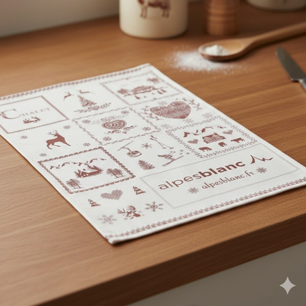 - L’association du rouge savoyard et du fond blanc lumineux permet à ce torchon montagne de s’intégrer facilement dans tous les styles de cuisine.