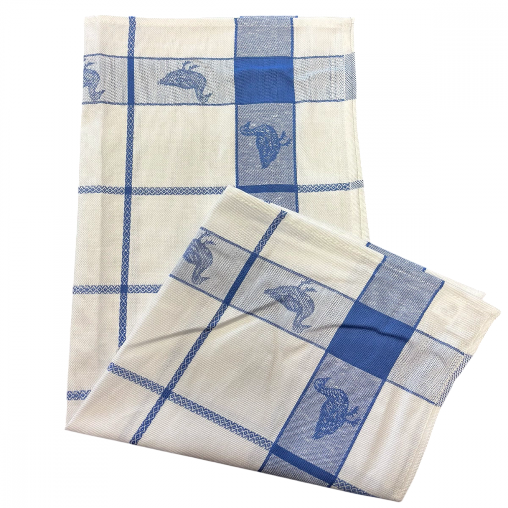 Le tissage jacquard permet d’intégrer directement les motifs dans la fibre, assurant ainsi des dessins nets et durables qui ne s’altèrent pas au lavage. Les carreaux aux couleurs rouge, bleu et gris, accompagnés du motif canard, apportent une touche traditionnelle et élégante à la cuisine.